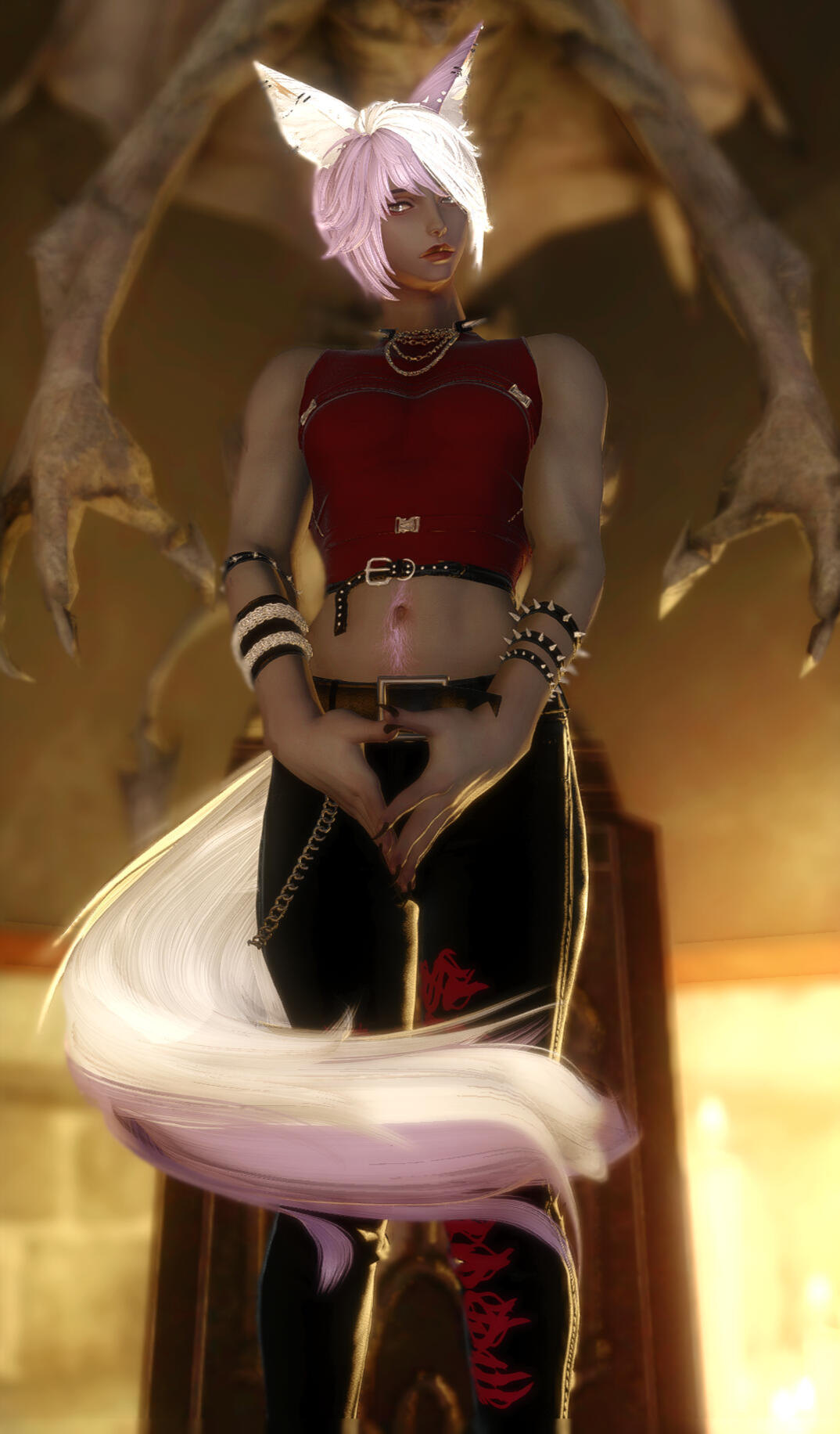 Role: 90% Sub, 10% Domme // bratKinks: BDSM, sensory deprivation, oral sex, breeding, teratophilia, breath play, knifeplay, exhibitionism, CNC/dub-con, orgasm control, praise, body worship, somnophilia, and a multitude more. Pretty much willing to try anything twice so feel free to ask!Hard limits: Scat, watersports, ageplay, vore, gore, sounding, snuff, Lala-related in any mannerBio: W'ikha has been living in Empyreum for some time and she recently met another Rava named Aura who had escaped from capture by the Garleans. Aura had been tortured and experimented on and used as a lab rat until she ran away, but had been enhanced and corrupted by Void energies that made her so horny she just fucked anything that was willing, further corrupting them too.W'ikha also has her own Void corruption from a fight with a Voidsent years ago in her past when she worked with the Machinists, having been cursed and corrupted before it escaped once she'd severely wounded it.W'ikha met Aura in a club in Ul'dah and they ended up having their fun. After several meetings Aura was convincing W'ikha to give into her own Void corruption and now felt the lustful and horny feelings more often then not and uses her looks and lost to satiate herself. This brought her to Haus Obscura after sensing the Void energies coming from the venue, enticing her to walk inside. She joined the roster of staff, getting to know guests in an effort to quell and quench the lustful desires inside her.